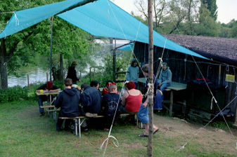 Offenes Feuer und kaltes Wasser Das Time out-Programm findet in einem Camp unter freiem Himmel auf dem Gelände eines der grössten Biobetriebe der Schweiz im schaffhausischen Rheinau in idyllischer Umgebung direkt am Ufer des Rheins statt. BILDUNG SCHWEIZ hat beim Besuch des Camps, Mitte Mai, eine zweite Klasse der Schule für Berufs- und Weiterbildung (SBW) Frauenfeld, eine Privatschule, angetroffen. Die 13 Knaben und vier Mädchen organisieren sich unter der Leitung von Eberhardt weitgehend selbstständig: geschlafen wird in Zelten, gekocht auf dem offenen Feuer, gearbeitet an verschiedenen, durch Planen geschützten Arbeitsplätzen. Büro und Vorratsraum sind in einem ehemaligen Hühnerstall untergebracht; fliessend kaltes Wasser gibts aus dem Gartenschlauch; WC und Duschen dürfen im nahe-gelegenen Kloster benutzt werden. Das Freizeitangebot bieten die Natur, der Rhein, die selber gezimmerten Kajaks und das Hallenbad. Letzteres ist an einem Tag, wie dem 22. Mai, der verregnet und kühl ist, besonders beliebt.